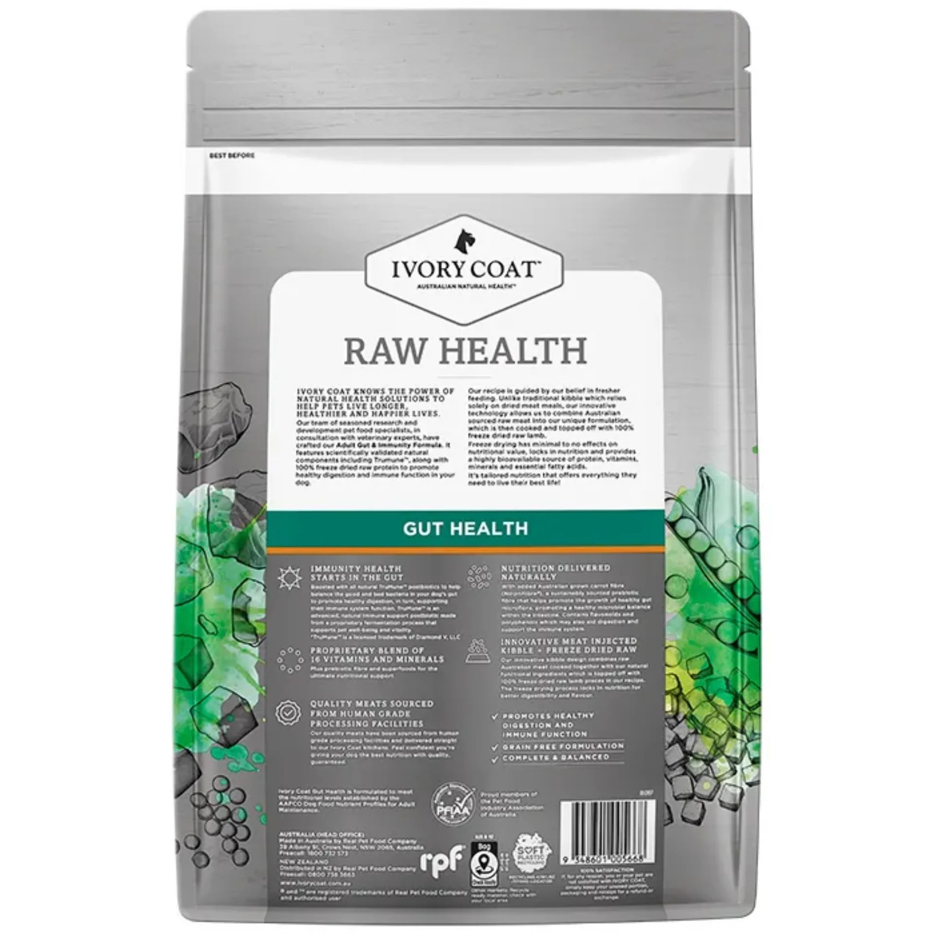 Give your dog advanced digestive support with Ivory Coat Raw Health Gut Health. This formula features a combination of raw-enhanced technologies: a meat-injected kibble base topped with freeze-dried raw lamb, which helps retain nutrient integrity and improve palatability. TruMune® postbiotics help balance gut flora, promoting a healthy digestive ecosystem. Carrot fibre (NinjinFibre®) acts as a prebiotic, feeding beneficial microbes to support gut health. Flavonoids and polyphenols may further aid digestion and support immune function. This gut-focused, grain-free formula is carefully balanced to serve as a complete and nutritious diet for adult dogs, helping maintain digestive wellness and overall vitality.