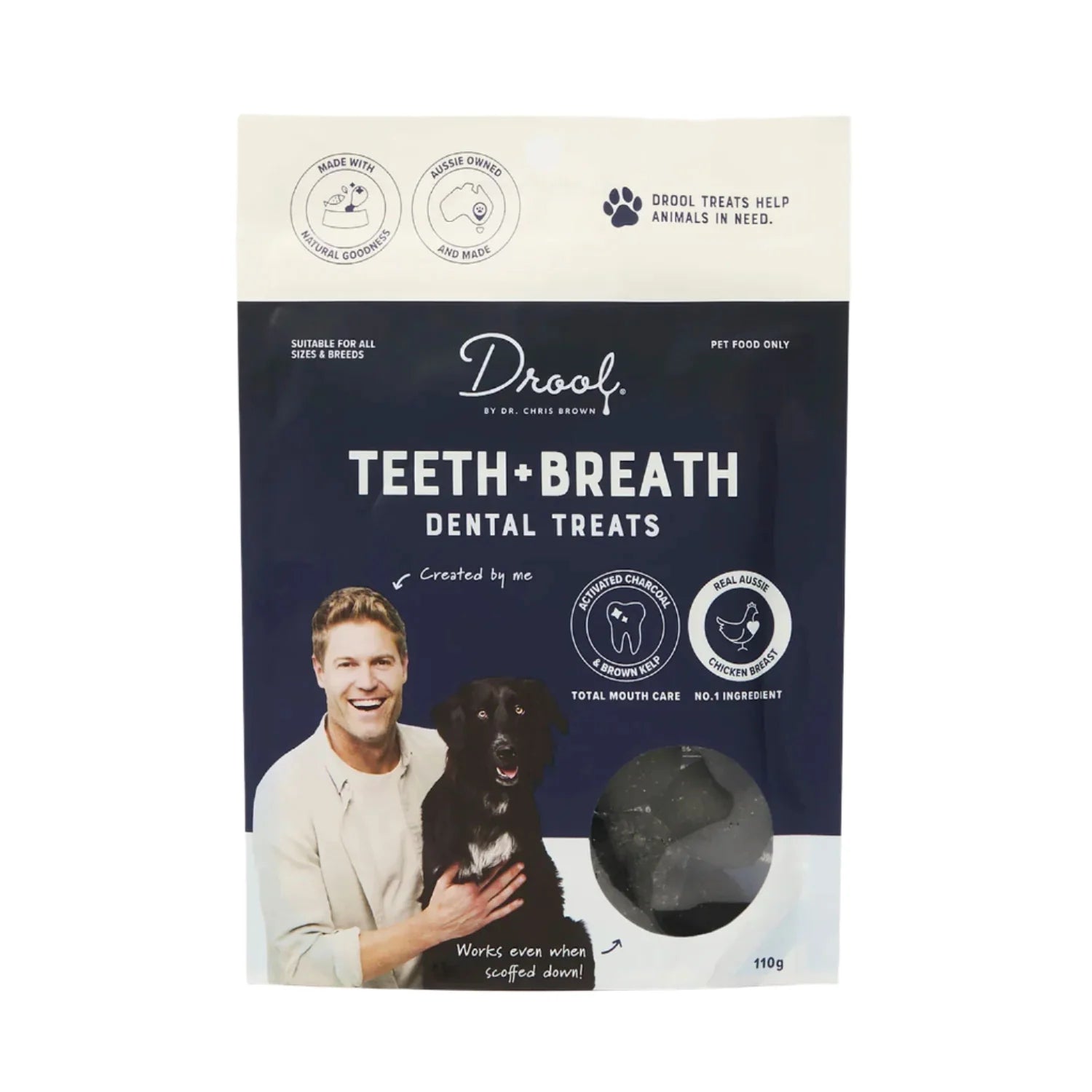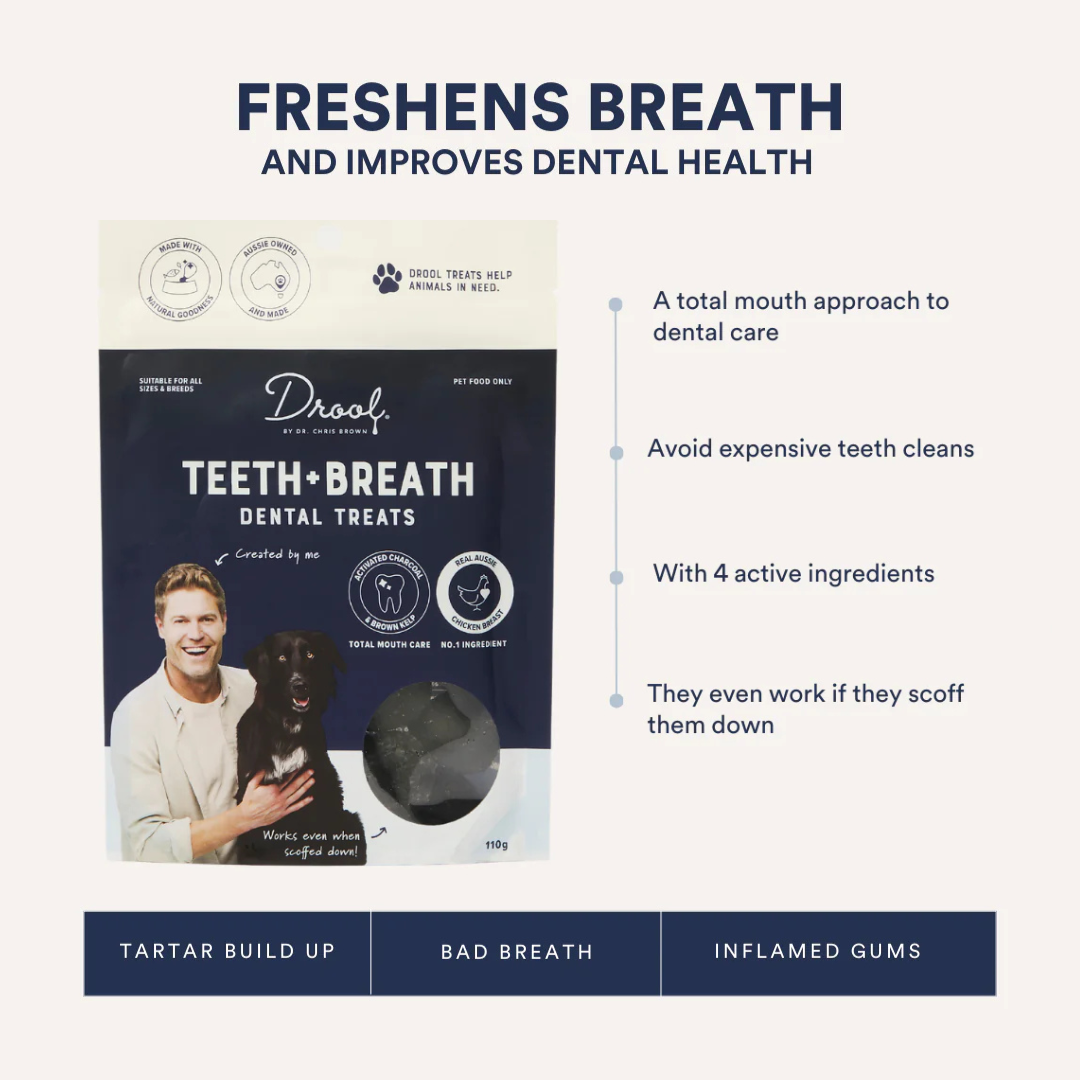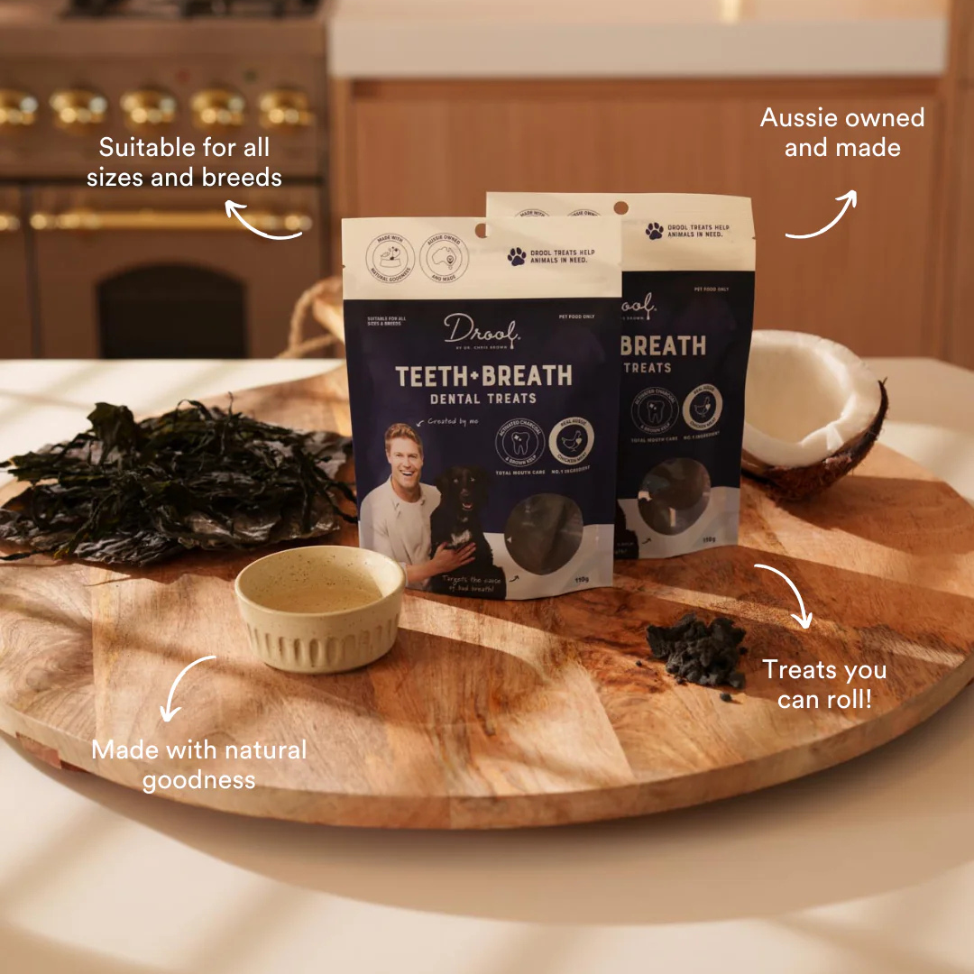 Drool by Dr. Chris Brown Teeth & Breath Balls are specially formulated treats designed to support your dog's oral health. These delicious, bite-sized snacks help reduce plaque and tartar build-up while freshening breath, making them a great addition to your pet’s daily dental care routine. Made with natural ingredients and free from artificial colours and preservatives, they are gentle on sensitive stomachs while providing essential nutrients. The unique texture encourages chewing, promoting healthier teeth and gums. Perfect for dogs of all sizes, these tasty dental treats help keep your pup’s mouth clean and fresh with every bite.