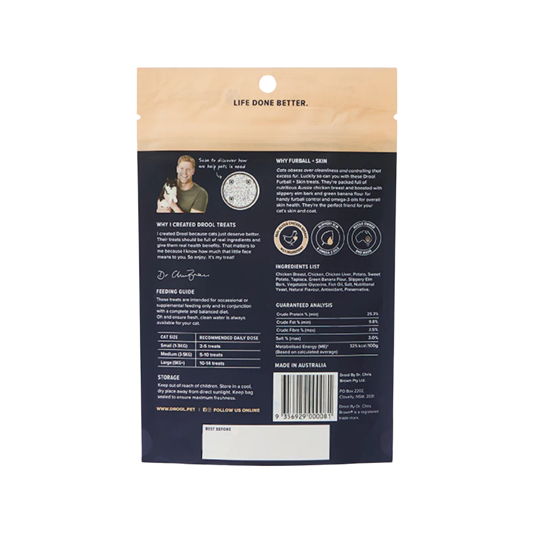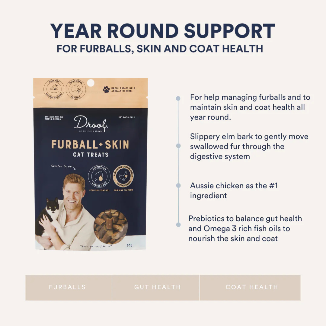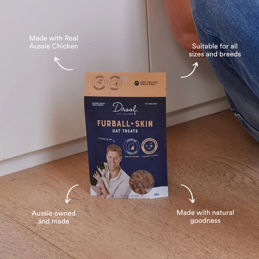 Drool by Dr. Chris Brown Furball & Skin is a specially formulated supplement designed to support your cat’s skin health and reduce furball formation. Made with natural, high-quality ingredients, it helps promote a soft, shiny coat while aiding digestion to minimise hairball build-up. Packed with essential vitamins, omega fatty acids, and fibre, this daily booster supports overall well-being and keeps your feline friend feeling their best. Easy to sprinkle over food, it’s a simple and effective way to care for your cat from the inside out. Give your cat the nourishment they deserve with Drool Furball & Skin.
