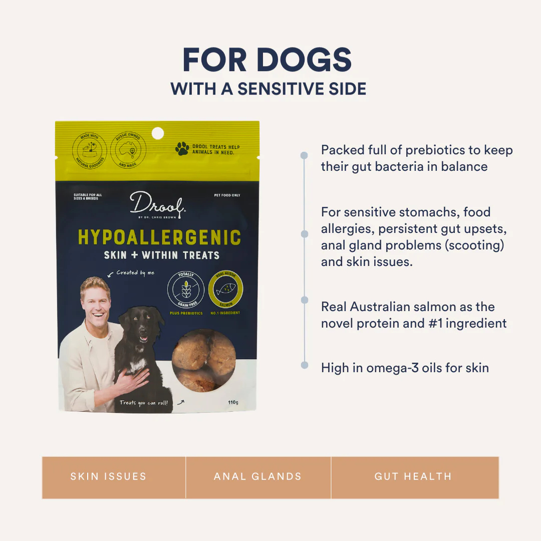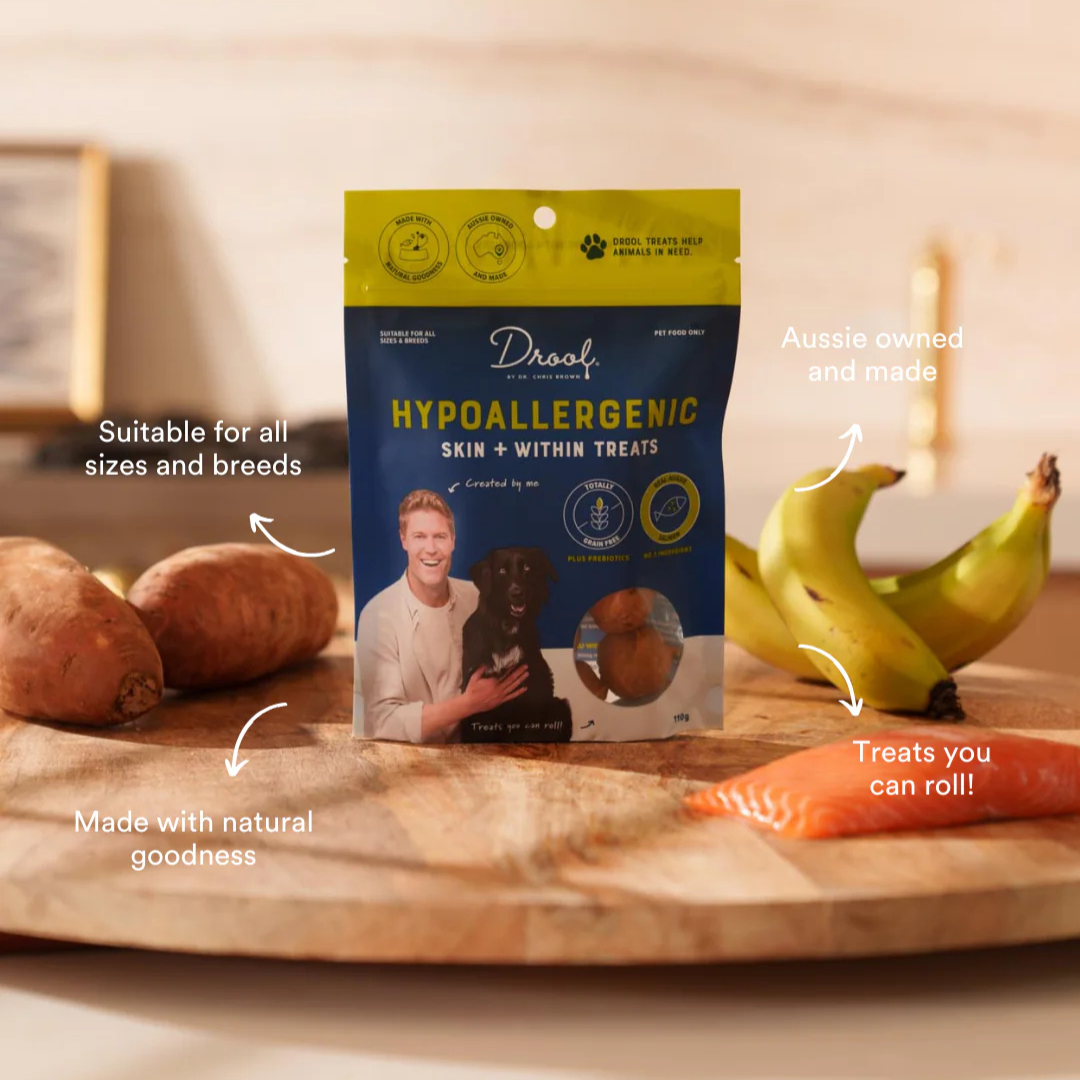 Drool by Dr. Chris Brown Salmon Hypoallergenic is a premium, vet-formulated pet food designed for dogs with sensitive stomachs or food allergies. Made with high-quality salmon as the primary protein source, this recipe is rich in omega-3 fatty acids to support healthy skin, a shiny coat, and overall well-being. Free from common allergens such as wheat, soy, and artificial additives, it provides a highly digestible and nutritious meal for dogs of all breeds and sizes. Carefully crafted to promote optimal digestion and long-term health, this hypoallergenic formula ensures your pet enjoys a delicious, nourishing diet without the risk of irritation.