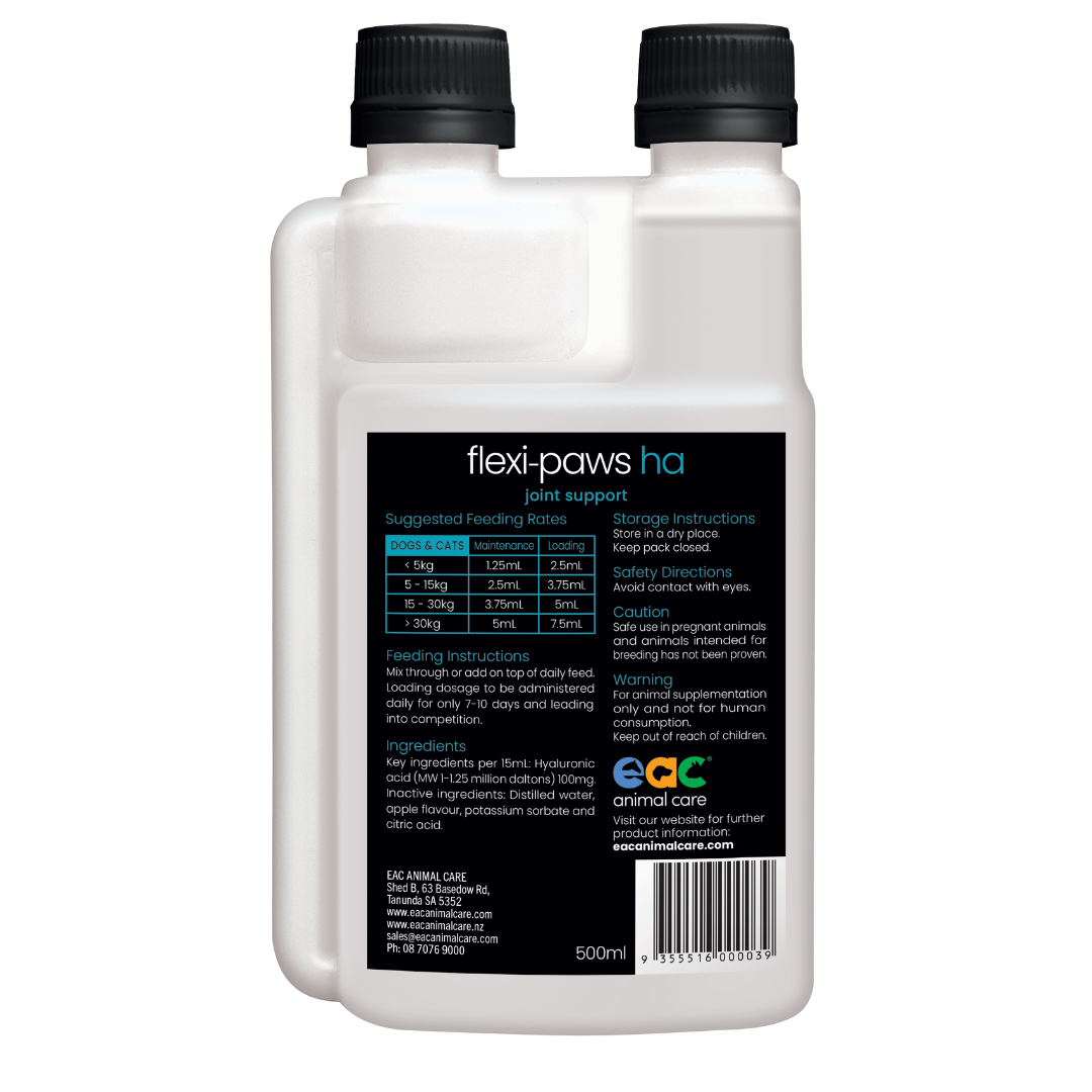 A useful addition for pets with arthritis or pets that participate in agility training. If this is used as a treatment, a loading dose for 7-10 days is required before continuing on with the maintenance dosage. This is paired well with EAC Flexi-paws MSM, EAC In-Sideout & EAC Shine & Glide.