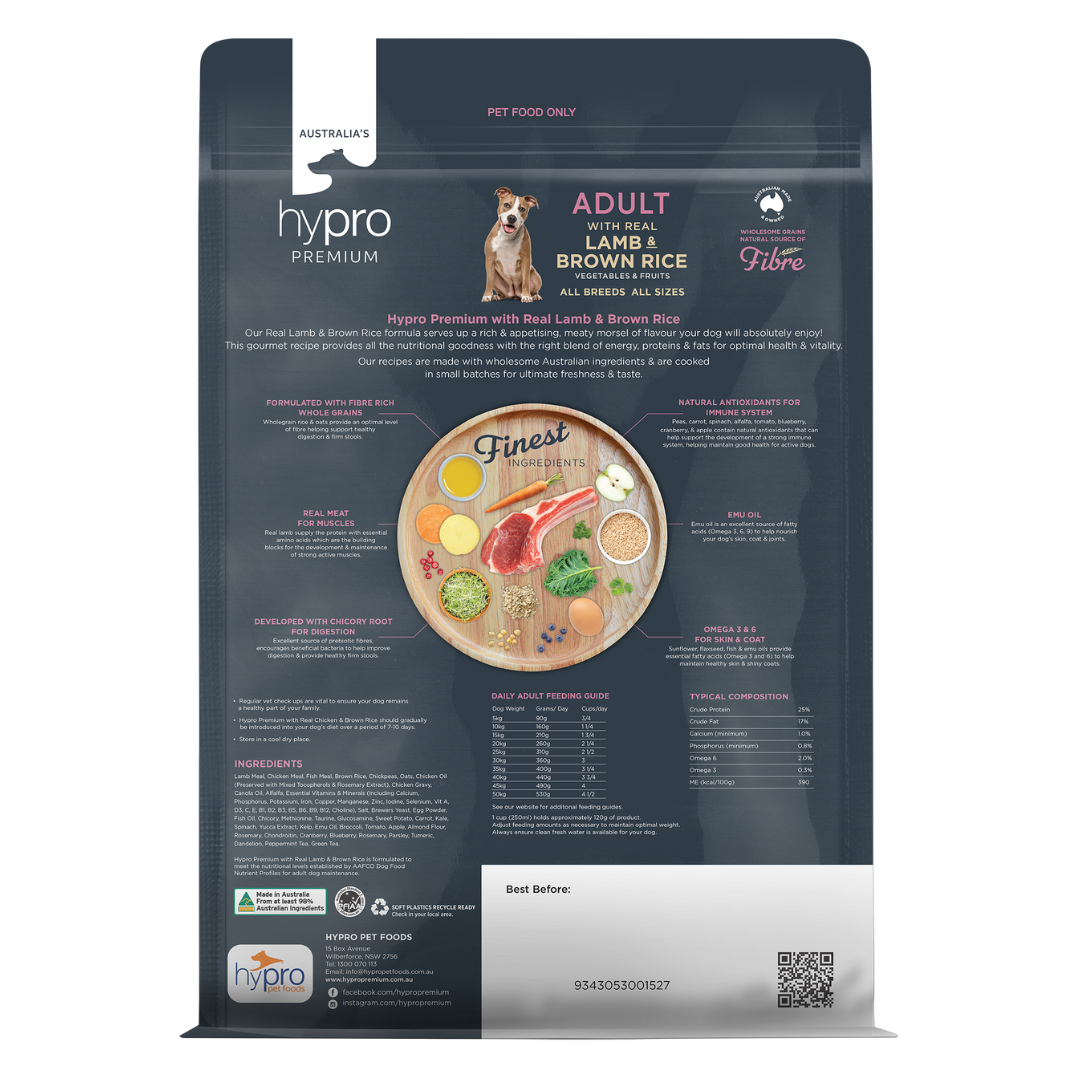 Hypro Premium Adult Lamb & Brown Rice is a nutritious, Australian-made dry dog food crafted to support your dog's overall health and well-being.
