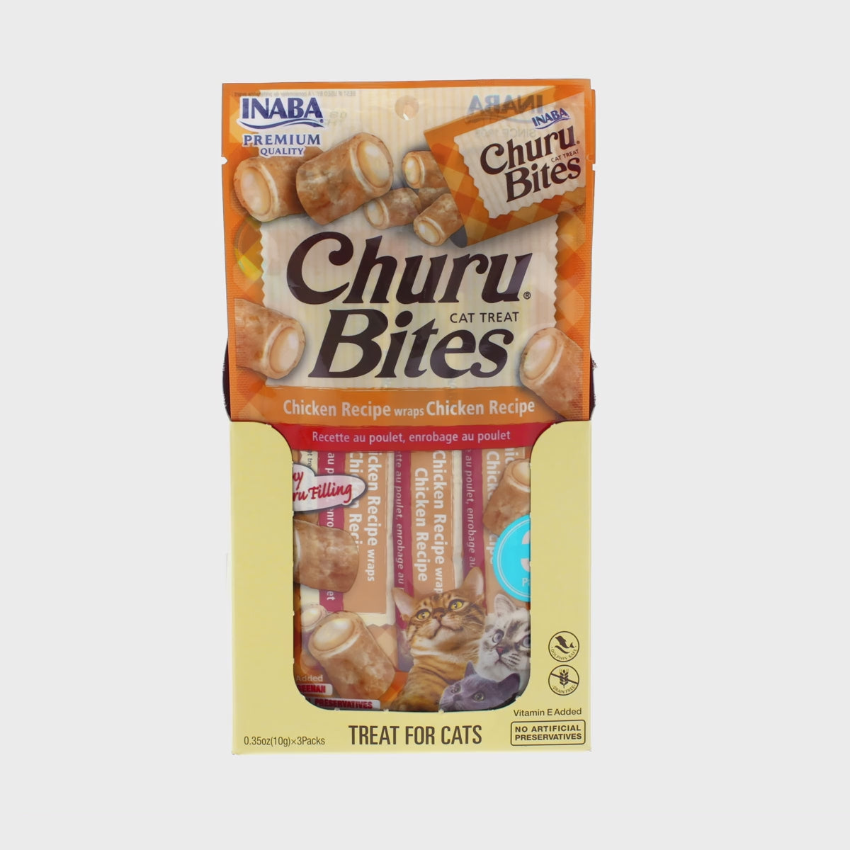 Twice the Texture. Each pillow-shaped bite starts with a soft baked chicken paste with no grains, preservatives, carrageenan, or artificial colours. Then we fill the centres with INABA's delicious Churu filling to give your cat twice the texture