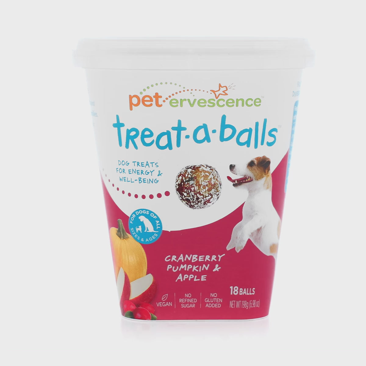 Petervescence Treat-A-Balls Cranberry, Pumpkin, and Apple are made with 100% natural ingredients, providing digestive support, antioxidants, and essential vitamins, while being free from artificial colours, flavours, fillers, and preservatives, making them suitable for dogs of all breeds and ages.