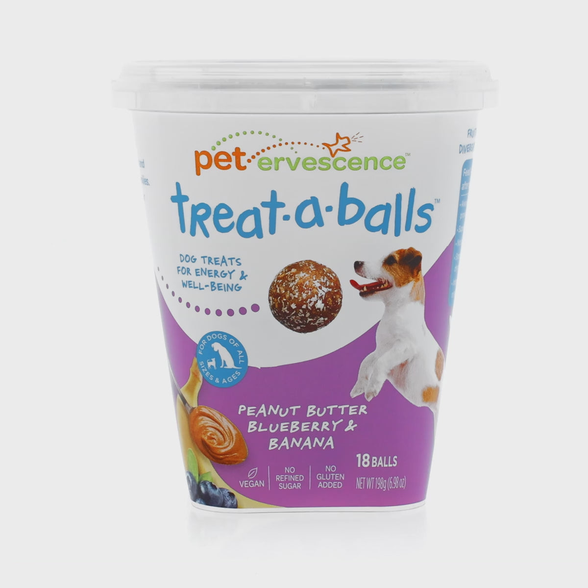 Petervescence Treat-A-Balls Peanut Butter, Blueberry, and Banana provide health benefits such as supporting digestion, boosting immunity with antioxidants, and promoting overall well-being with natural ingredients, making them a wholesome snack for dogs.