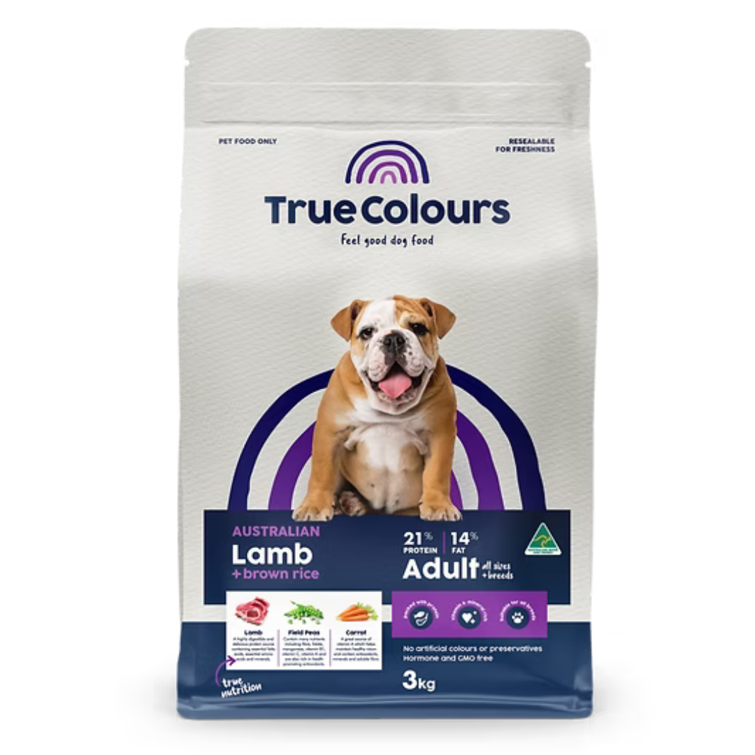 Made in Australia. It is recommended to have an easy 7-day transition to True Colours. Simply start by mixing 25% of True Colours with your dog's old food and gradually increase over 7 days.
