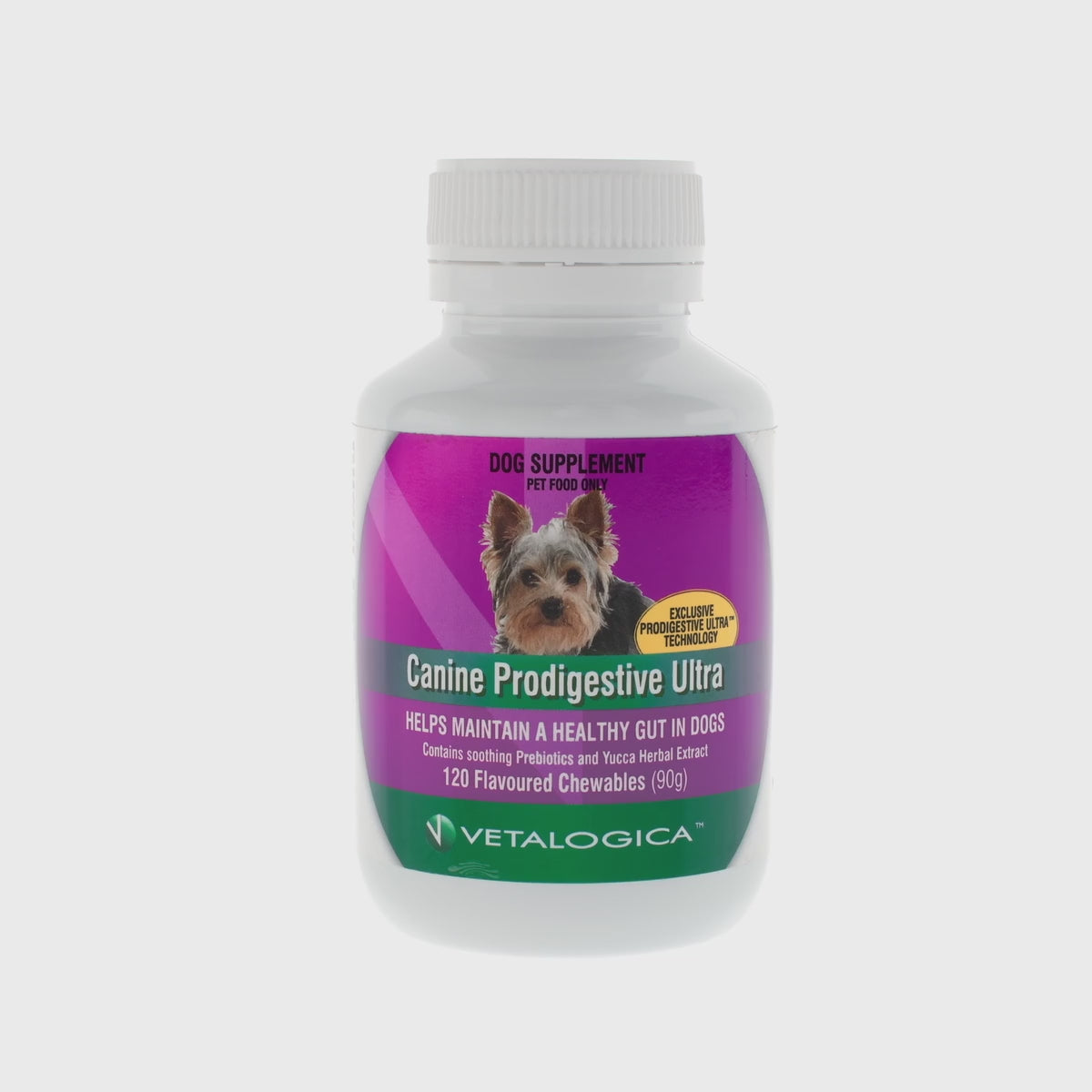 Vetalogica Canine Prodigestive Ultra is a specialised supplement designed to support optimal digestive health in dogs. This innovative formula combines a precise ratio of prebiotics and yucca extract to promote a healthy gut microflora. It improves digestion and reduces digestive discomfort and alleviates symptoms of gas, bloating, and diarrhea.