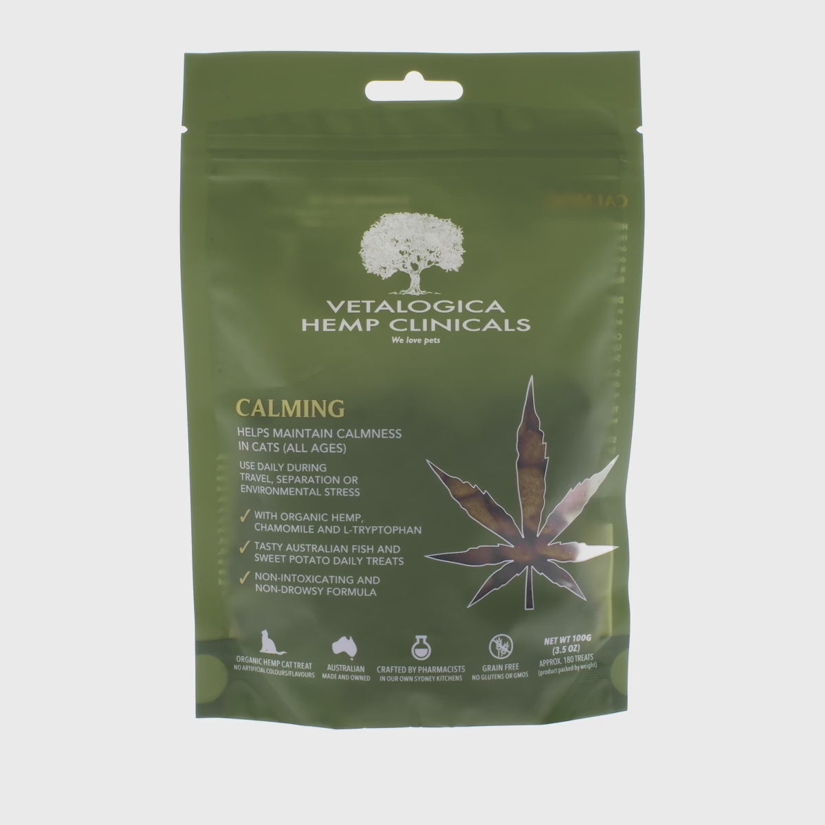 Vetalogica Hemp Calming Cat Treats offer gentle, natural relief. Made with organic hemp, chamomile, and L-tryptophan, these treats promote relaxation and ease stress during travel, vet visits, or loud noises.