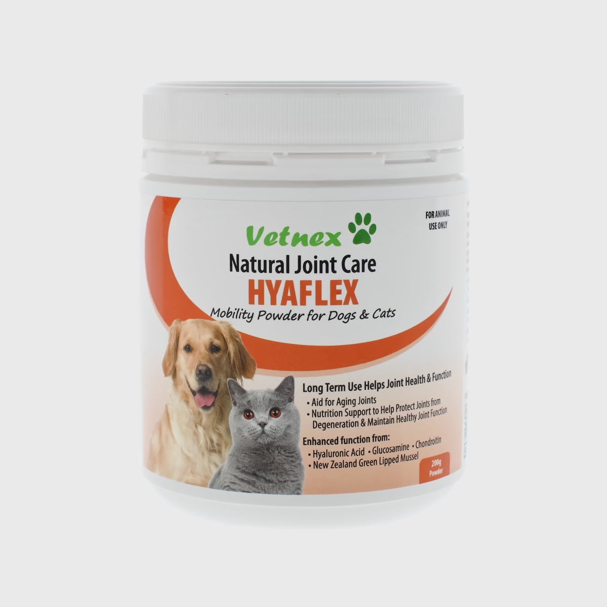 Vetnex Hyaflex Mobility Powder is a premium joint supplement formulated to support the health and mobility of dogs and cats. This tasty powder contains a unique blend of natural ingredients, including hyaluronic acid, glucosamine, chondroitin, and New Zealand green-lipped mussel, all known for their beneficial effects on joint health.