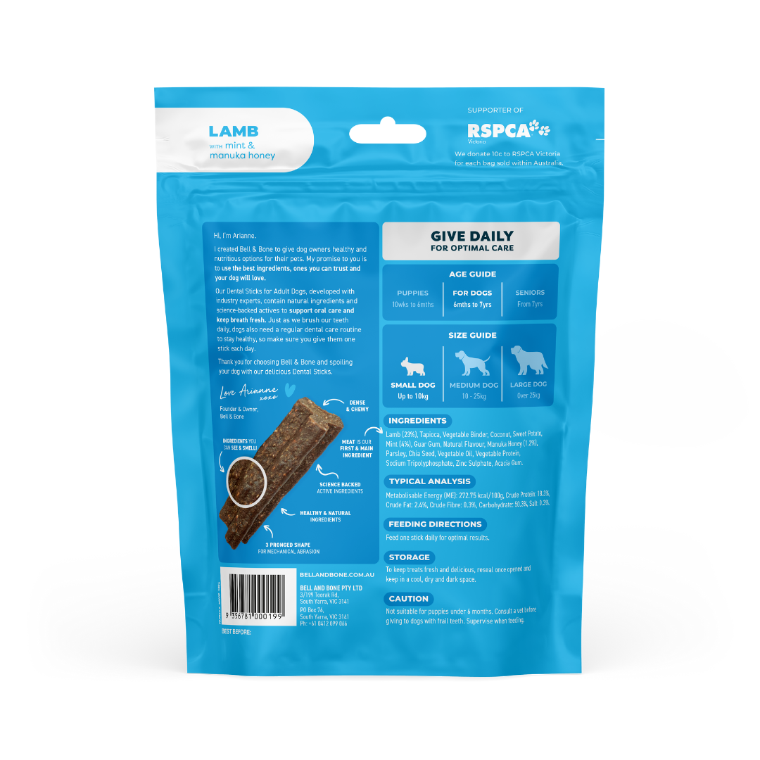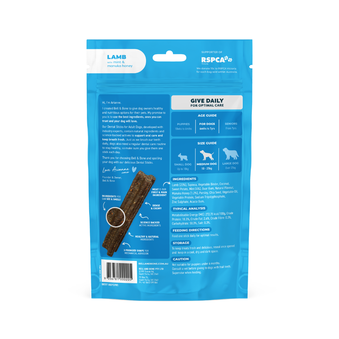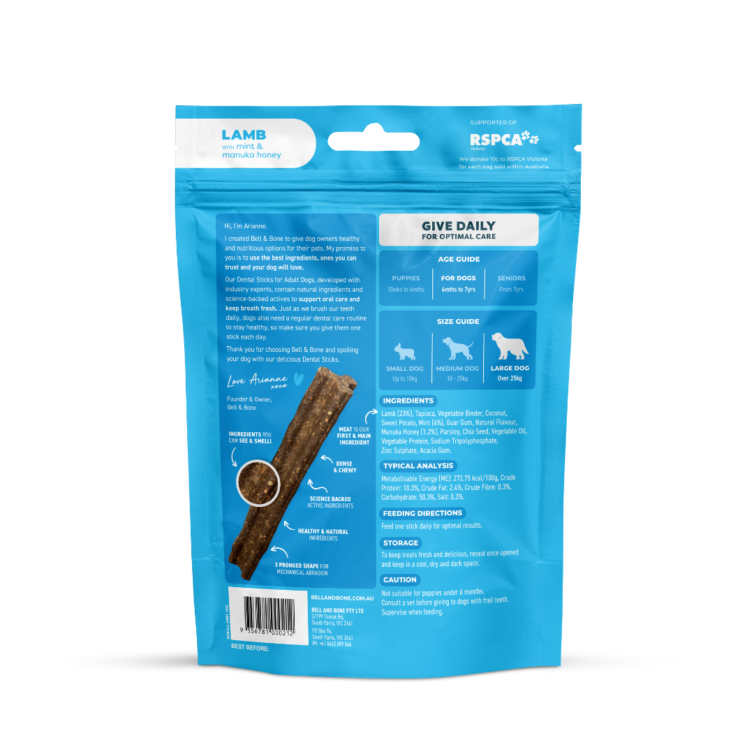 Developed with industry experts, the Dental Sticks with Lamb, Mint & Manuka Honey were created to promote better oral care for your dog. By feeding 1 stick daily, the dental sticks can help fight plaque and tartar through mechanical abrasion and chemical action.