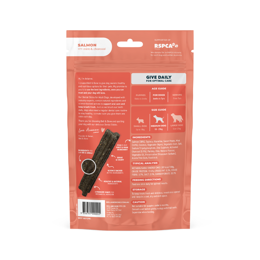 Developed with industry experts, the Dental Sticks with Salmon, Mint & Charcoal were created to promote better oral care for your dog. By feeding 1 stick daily, the dental sticks can help fight plaque and tartar through mechanical abrasion and chemical action.