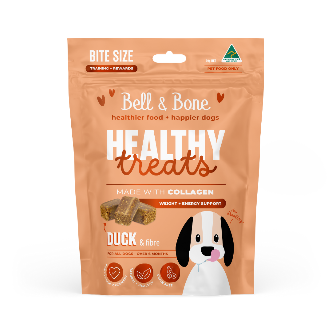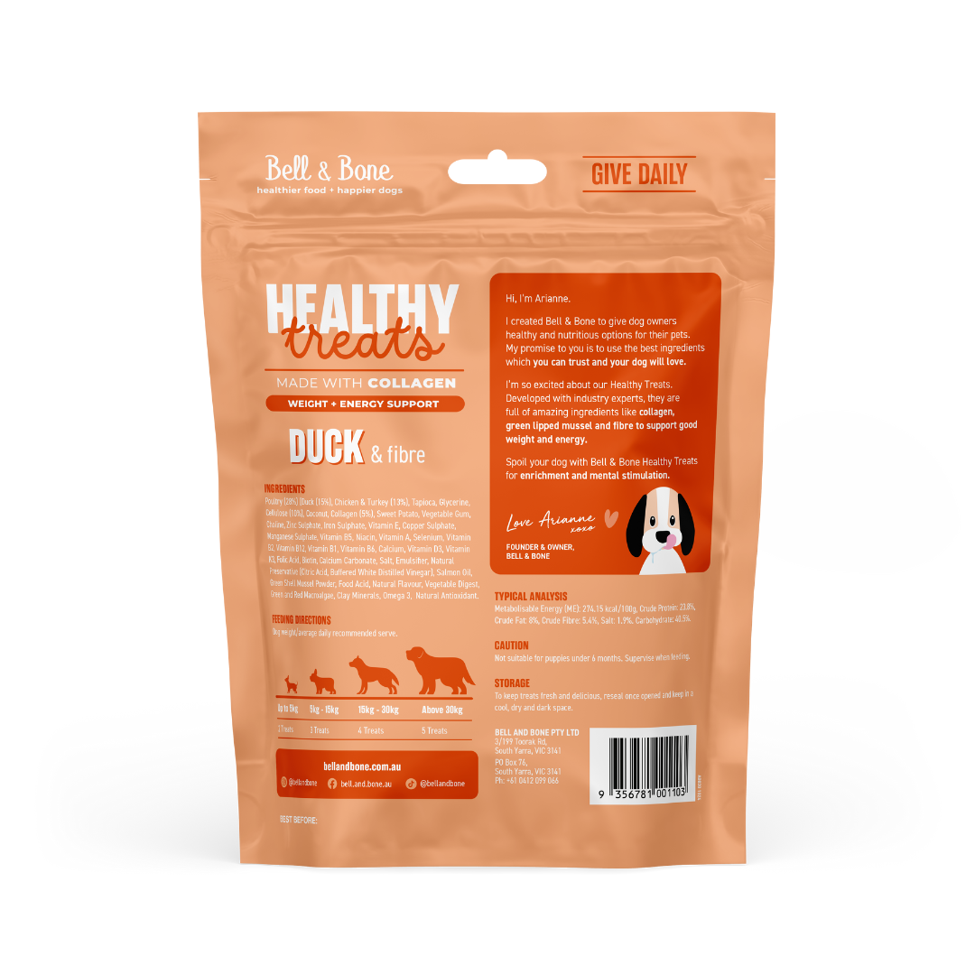 Developed with industry experts, our Healthy Treats: Duck & Fibre for weight and energy support were created to keep your dog feeling like their best selves from the inside out. By using only the highest quality collagen, owners can feel good about the treats they choose for their pets, as collagen aids in digestion by breaking down proteins, strengthening and soothing the lining of the gut due to its amino acid properties.