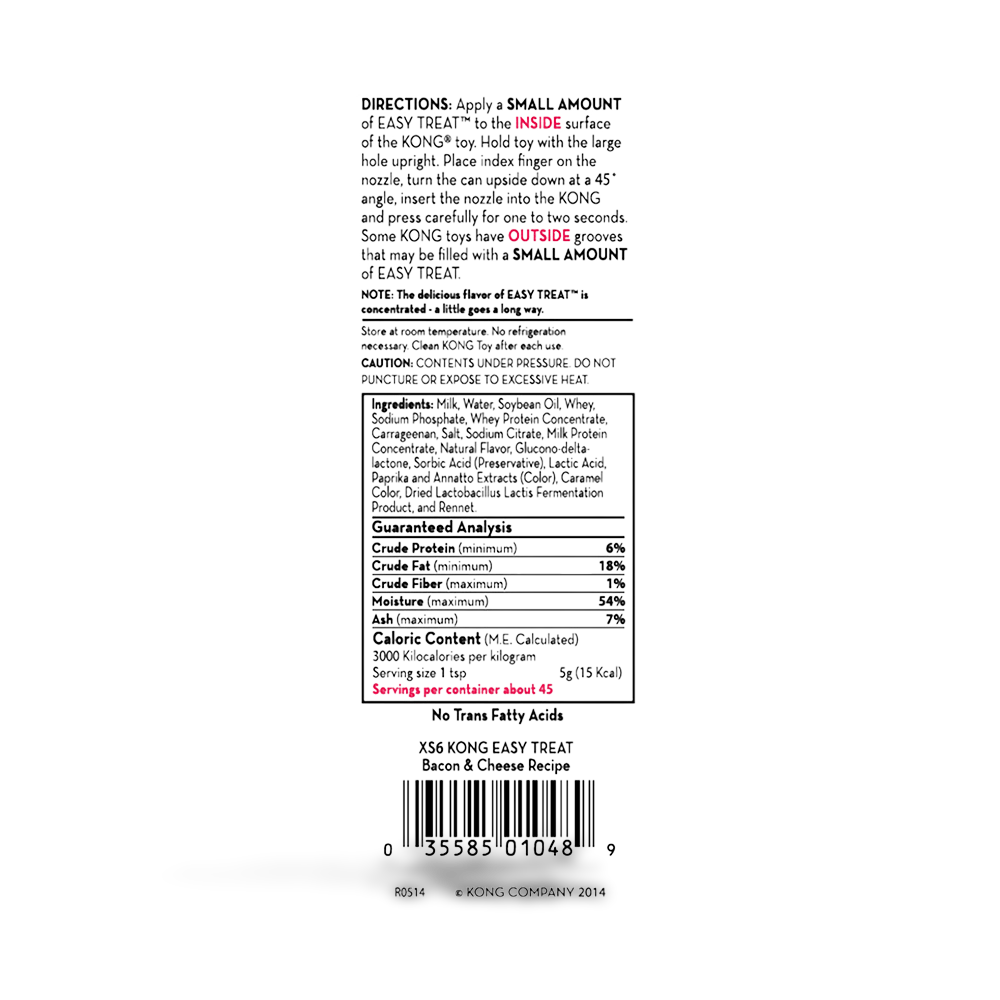 Make reward time exciting with the KONG Easy Treat Bacon & Cheese. This indulgent paste features authentic bacon and cheese flavours in a convenient, no-mess format built for toy stuffing or direct licking.