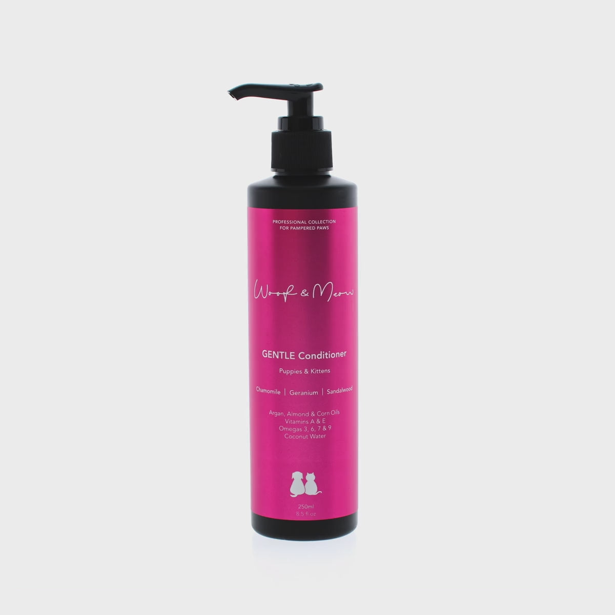 Woof & Meow Gentle Conditioner is a nourishing, all-natural formula designed to soften and detangle your pet's coat, leaving it smooth, shiny, and manageable, while also supporting skin hydration and overall coat health.