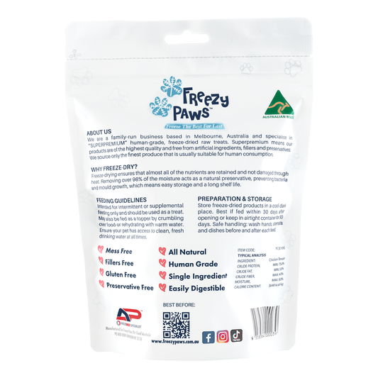 Freezy Paws products in Australia. Freezy Paws use natural, protiens and organs to maximise nutrition and help keep your pets healthy with freeze-dried, raw treats.