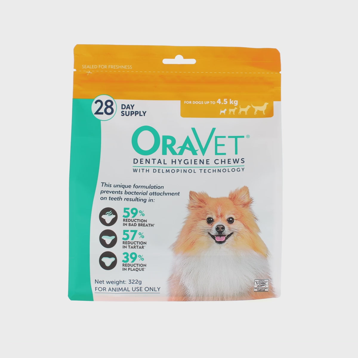 Healthy Pet Co. Oravet Dental Chews (Extra Small) are tasty, all-natural chews designed to promote your dog's oral health and freshen their breath. Made with 100% natural ingredients, these chews are specifically formulated to reduce plaque and tartar buildup while supporting healthy teeth and gums. Each chew is packed with a unique blend of active ingredients to help protect against bad breath and promote overall dental hygiene. Free from artificial colours, flavours, and fillers, it’s a wholesome and effective addition to your dog’s daily routine. Perfect for small dogs under 15 lbs.