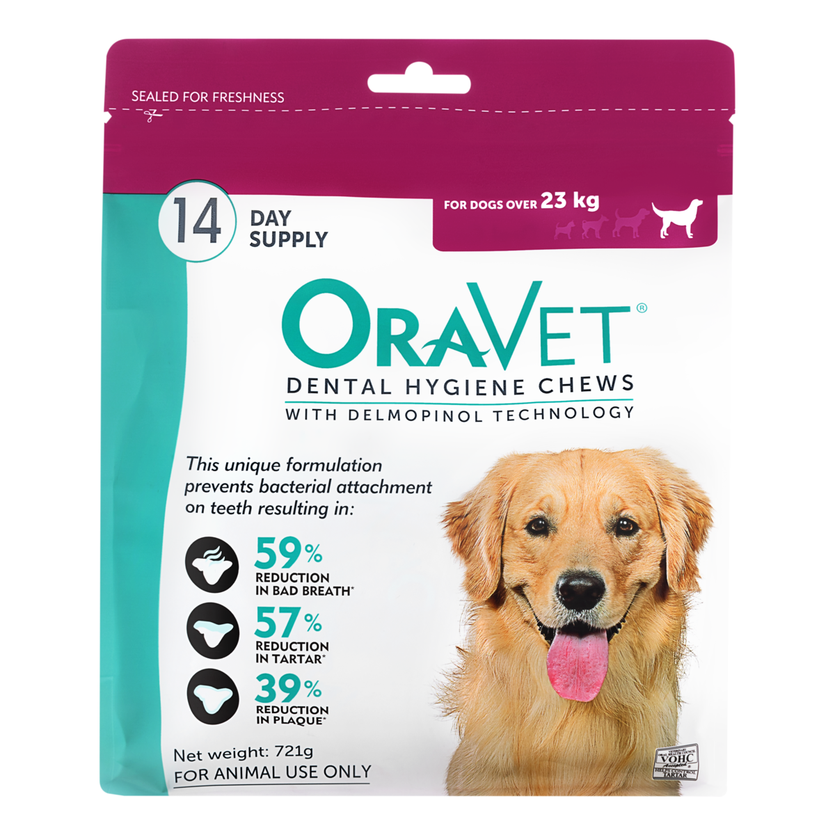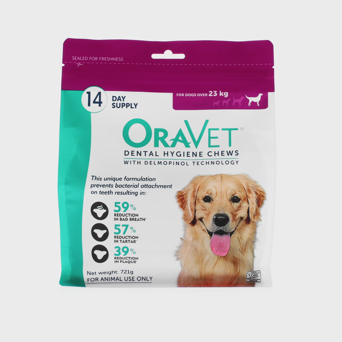 Healthy Pet Co. Oravet Dental Chews (Large) are a tasty, all-natural dental treat designed to help maintain your dog's oral health and freshen their breath. Made with high-quality ingredients, these chews are specially formulated to reduce plaque and tartar buildup, promoting healthy teeth and gums. Each chew provides a satisfying texture that helps clean your dog’s teeth while offering a delicious flavour they’ll love. Free from artificial colours, flavours, and preservatives, it’s a safe and effective addition to your dog’s dental care routine. Perfect for large dogs over 25 pounds.