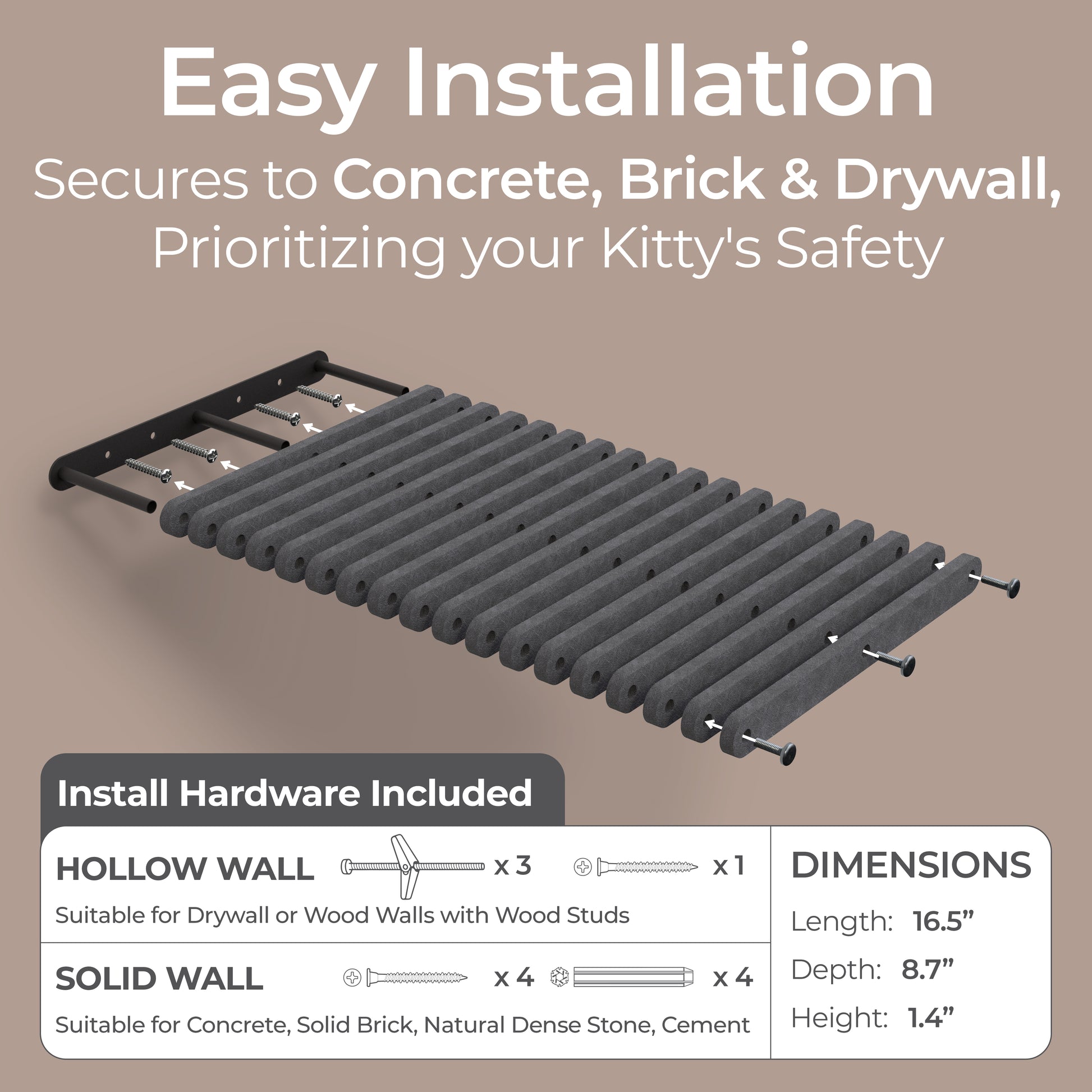 Handcrafted from premium, durable materials giving even the most adventurous cats a secure place to rest or play. With soft felt facades and powder-coated steel brackets, the design balances modern style with long-lasting performance, and are suitable for both indoor and outdoor installation.