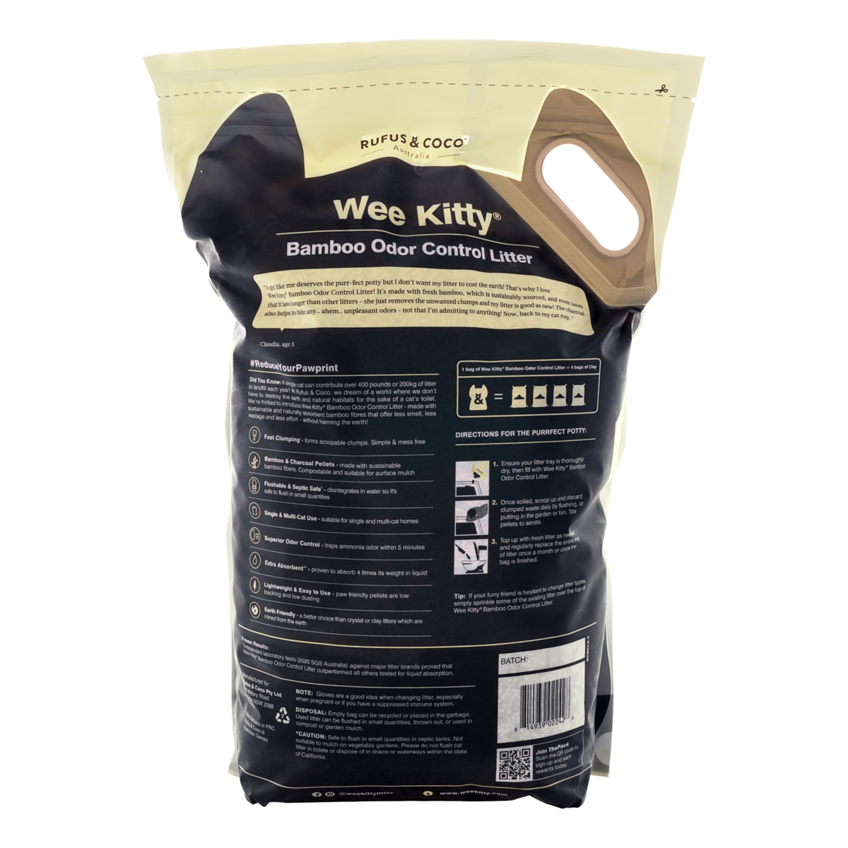 Easy to use and dispose of, Wee Kitty Bamboo Odour Control Litter ensures a clean, comfortable, and eco-conscious solution for your cat’s litter needs.