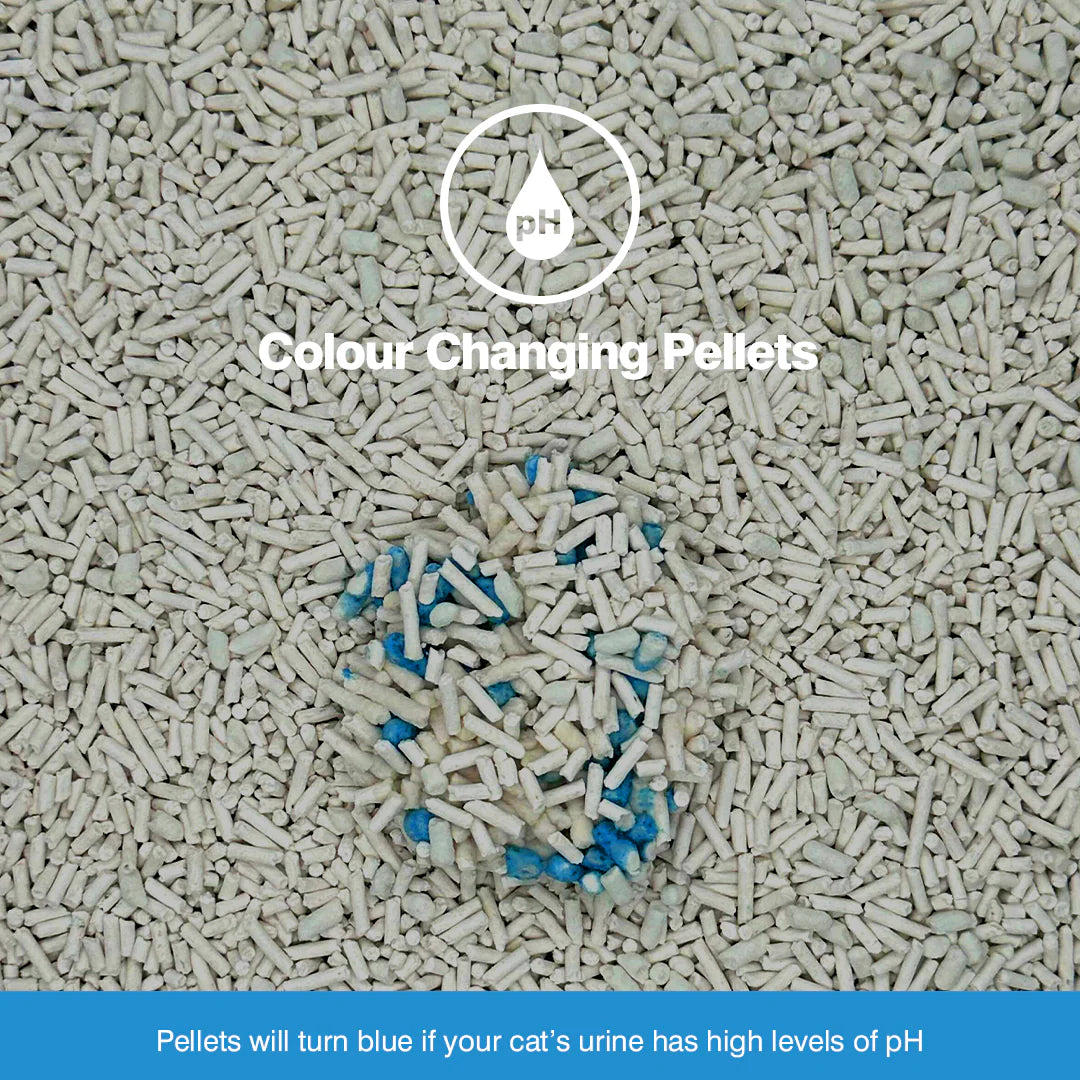 Available in 2kg and 9kg sizes, this clumping litter is made with natural tofu, and the pellets will turn blue when a high pH level is present. The darker the blue colour, the higher the pH levels present. If the litter does not change colour, you can rest assured that your cat's pH levels are within the normal range.