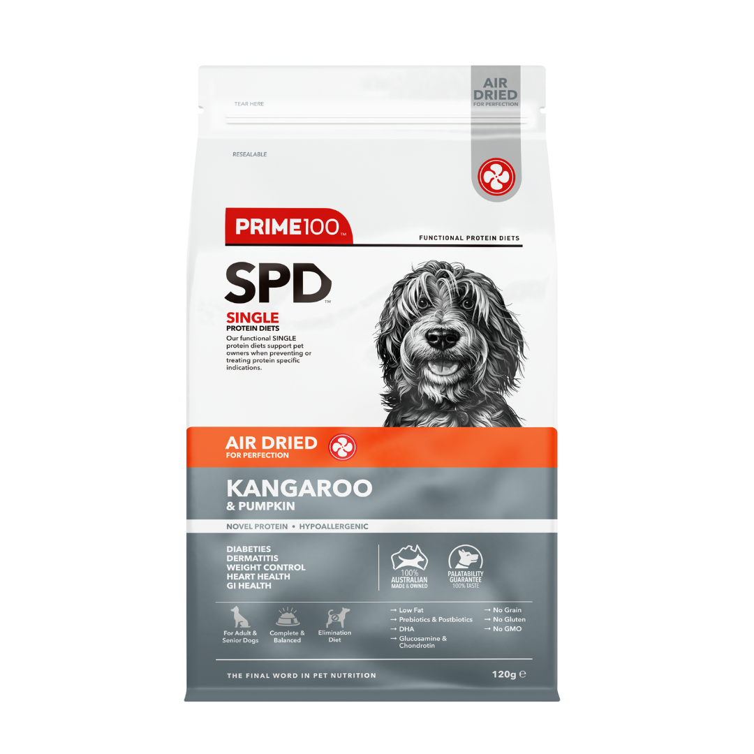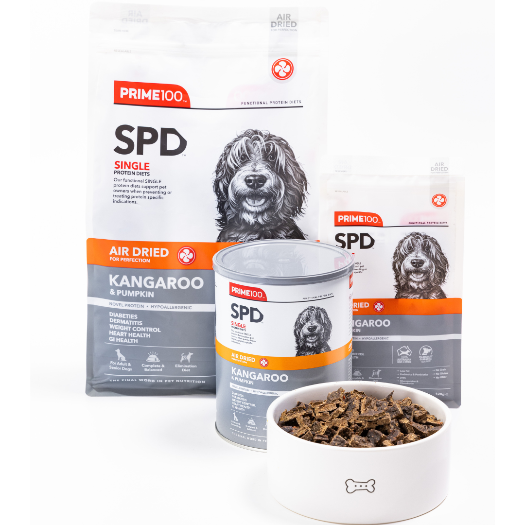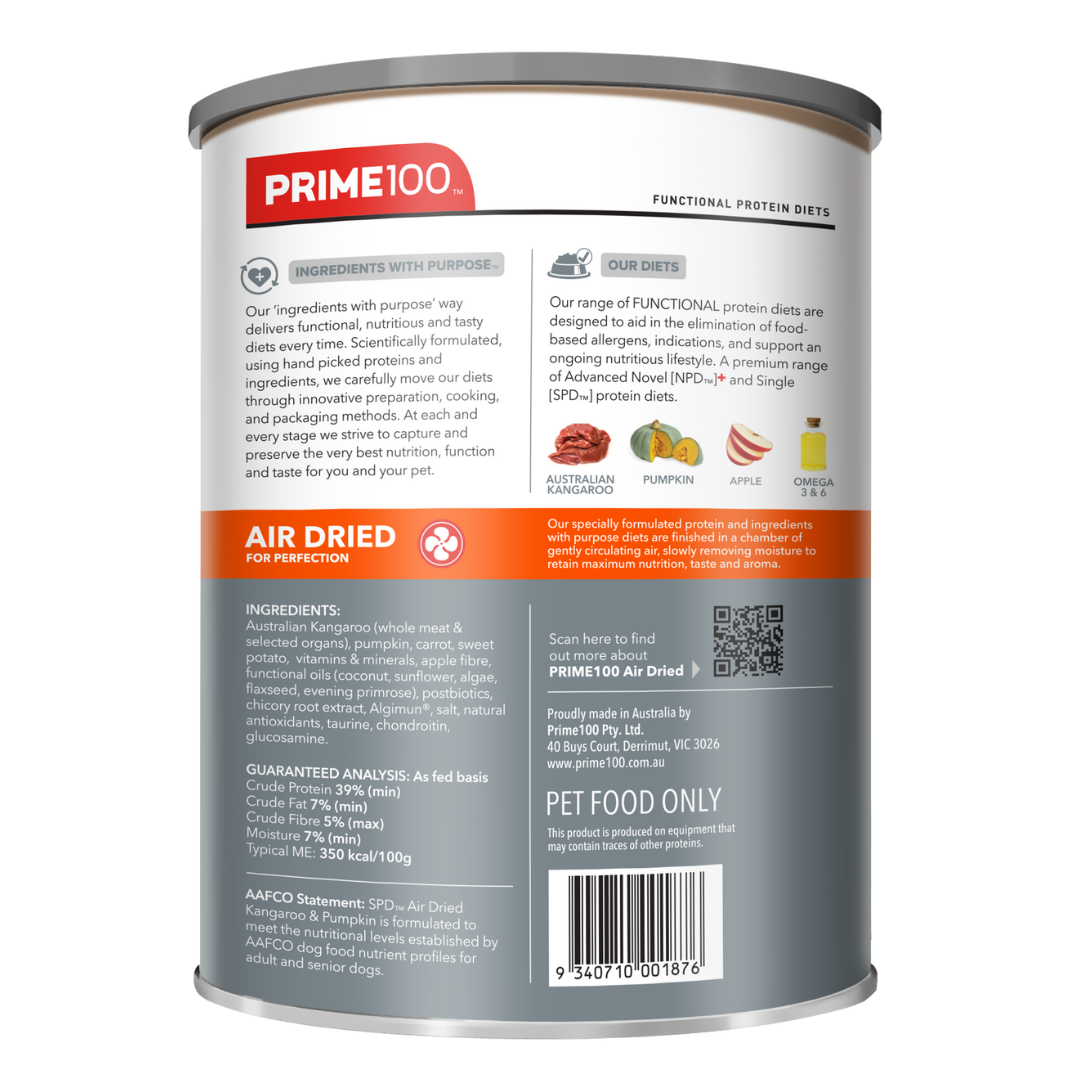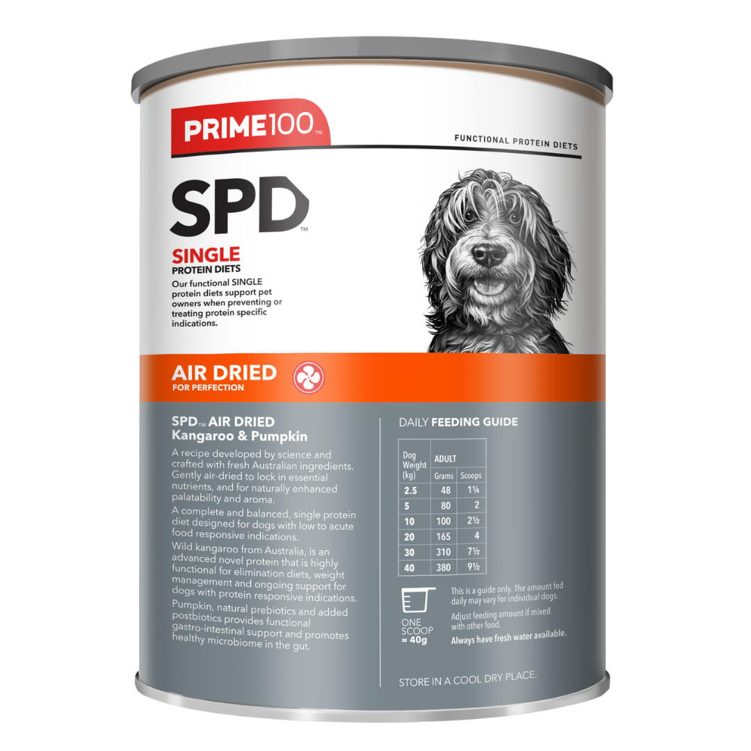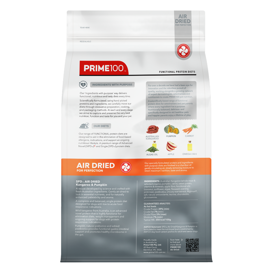 Nourish your dog with the unique and wholesome nutrition of Prime100 SPD Air Dried Kangaroo & Pumpkin! This scientifically developed recipe features Australian-sourced kangaroo as the primary protein source, providing a lean, novel protein option that's ideal for dogs with sensitivities.