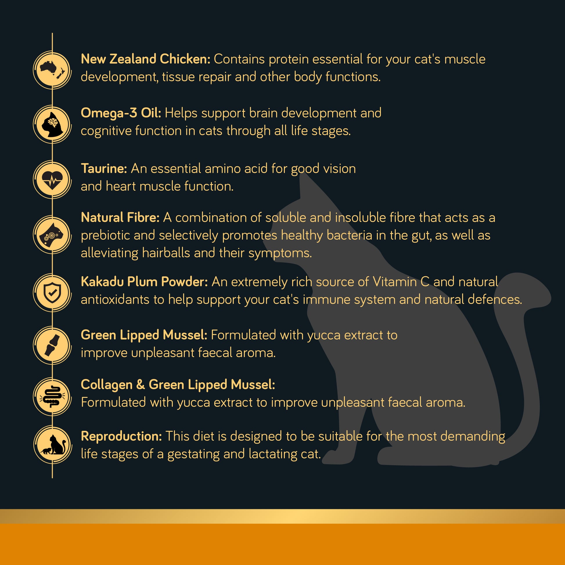 - Reproduction: This diet is designed to be suitable for the most demanding life stages of a gestating and lactating cat.
