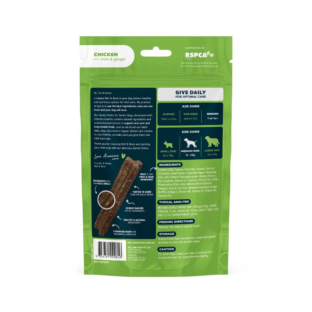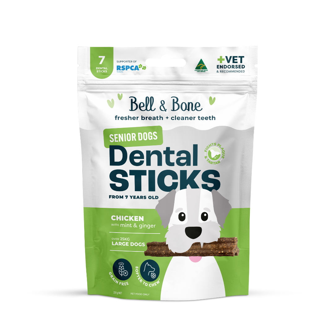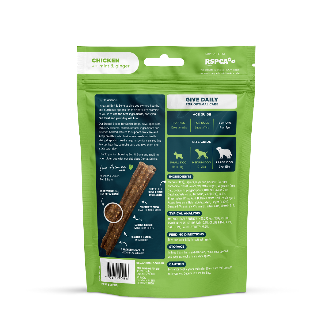 Bell & Bone’s Senior Chicken, Mint, and Ginger Dental Sticks have been developed specifically to support your senior dog’s oral care and overall well-being as they journey through their mature years. Fighting plaque and tartar build-up with their unique 3-pronged shape, these dental sticks are a softer chew tailored for senior dogs, encouraging gentle chewing and abrasion, and with the support of active ingredients.