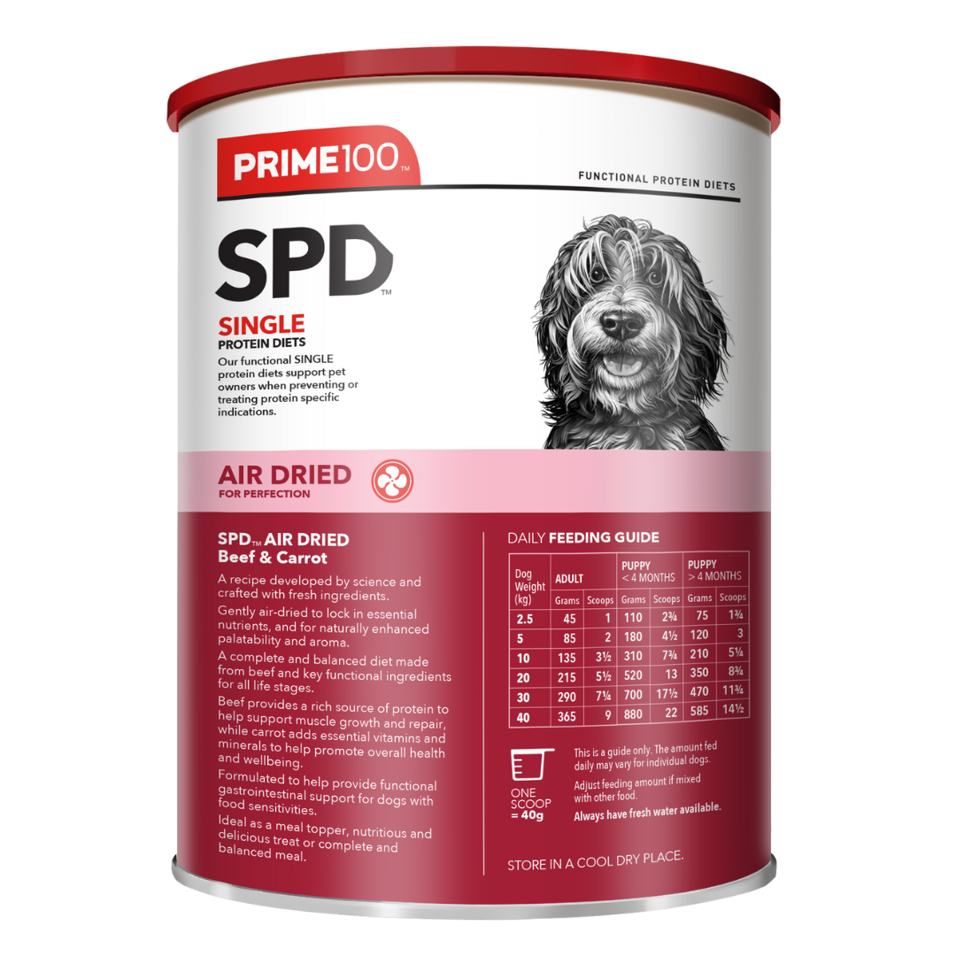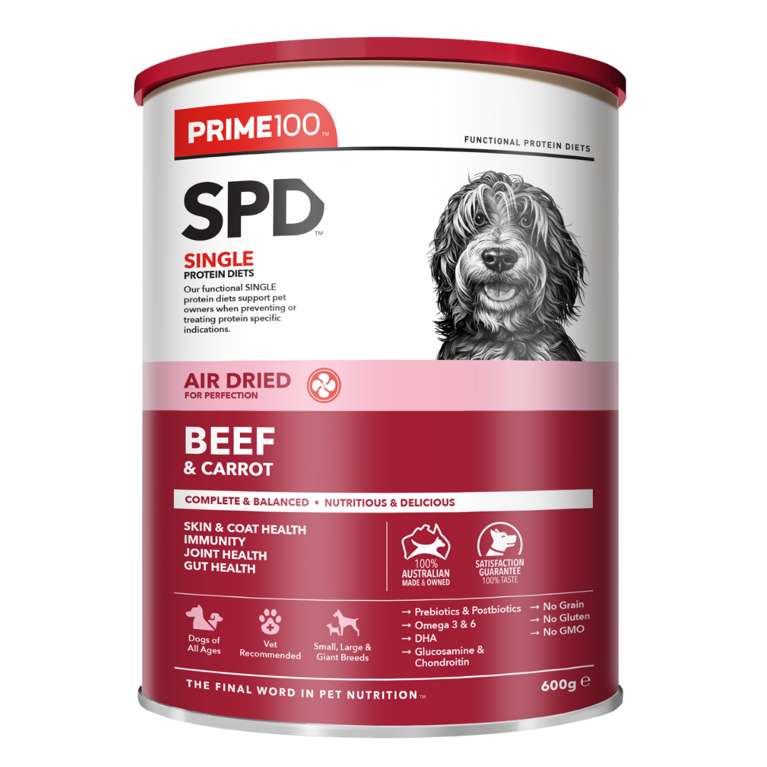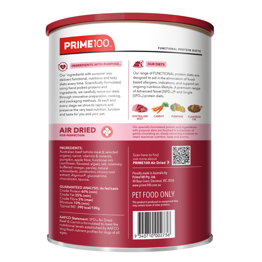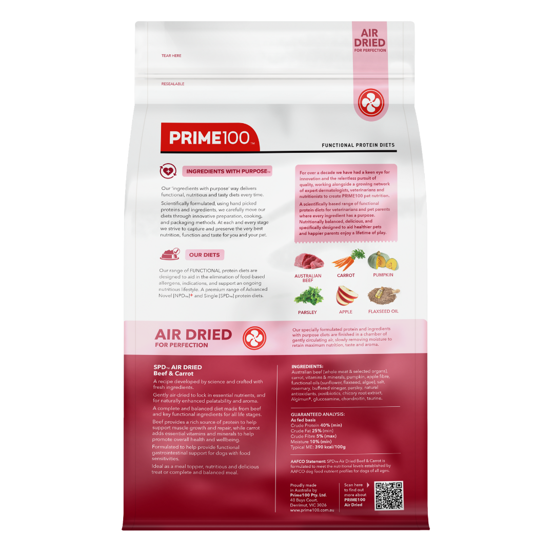 Nourish your dog with the pure essence of Australian ingredients! Prime100 SPD Air Dried Beef & Carrot is a testament to the perfect harmony of science and nature, meticulously crafted with fresh beef and functional ingredients to support your dog's overall health and well-being.